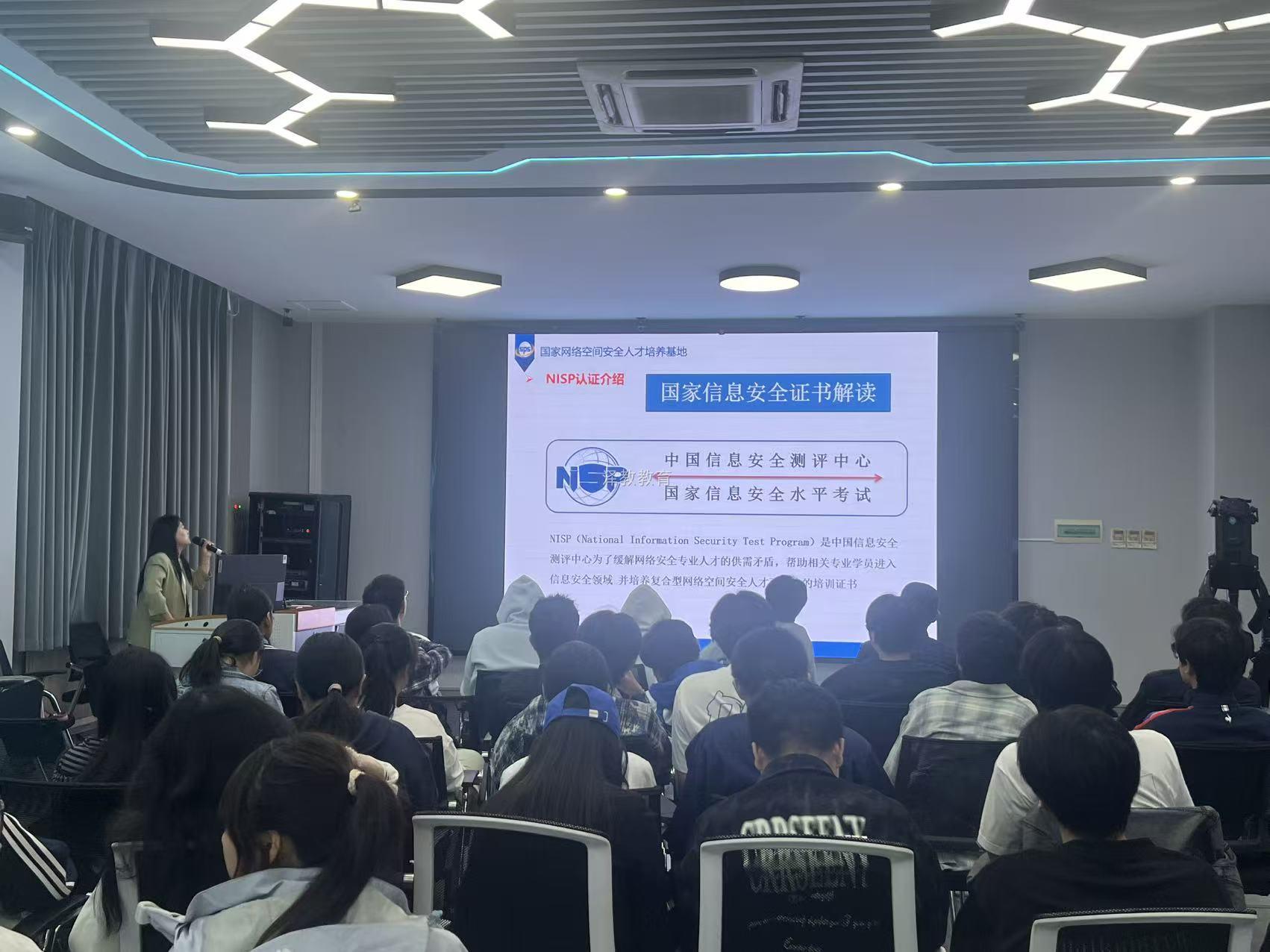 活动现场,泽教科技讲师紧扣“网络安全为人民,网络安全靠人民”的宣传周主题,以“校园WiFi风险、钓鱼链接陷阱”等贴近学生生活的案例切入,拆解日常网络行为中的安全漏洞;同时围绕NISP证书展开深度解读,从证书“国家信息安全水平考试”的权威属性,到对应网络安全运维等岗位的就业适配性,再到备考流程与学习资源,为学子铺就“考证+就业”的清晰路径。